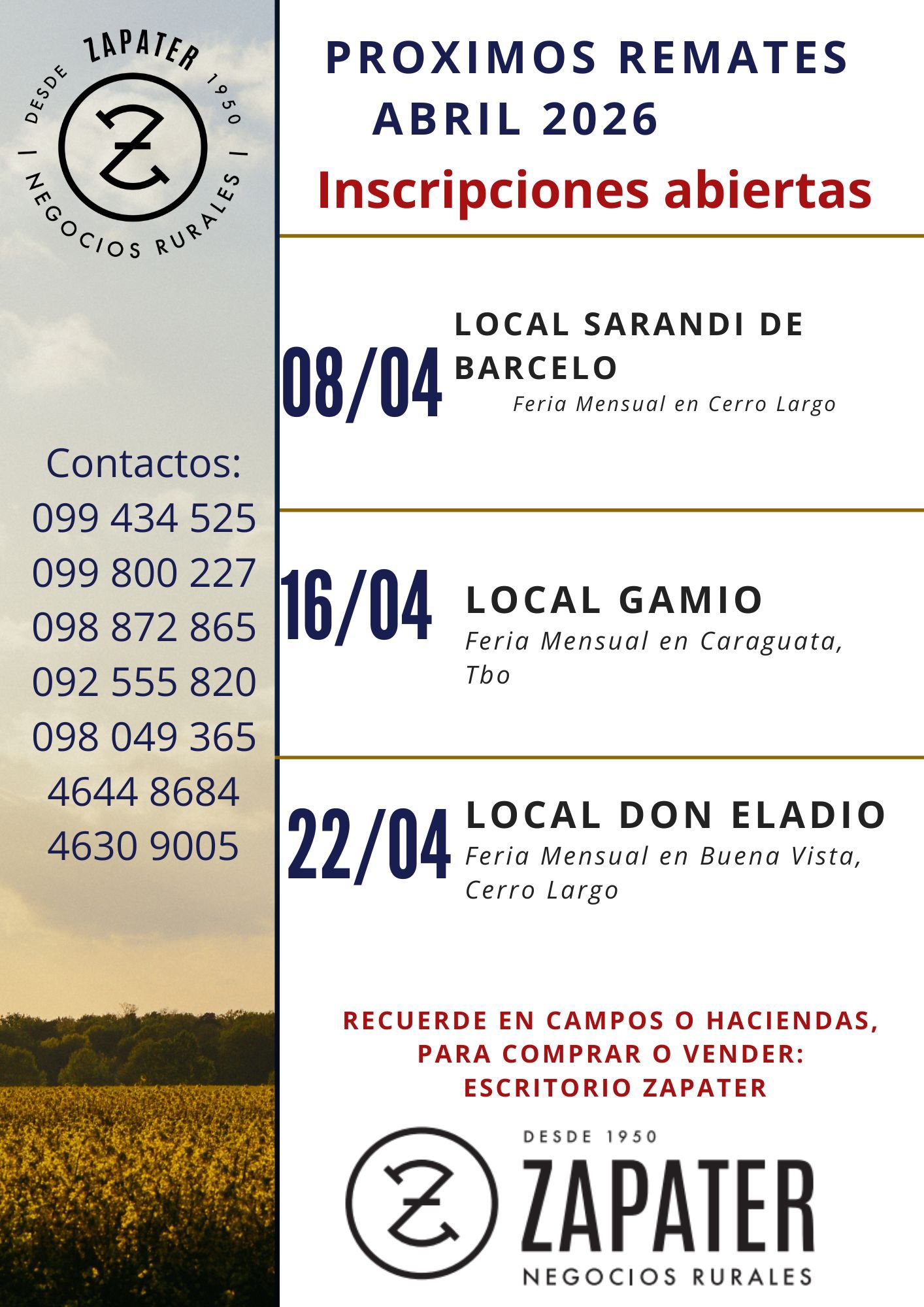 En ESCRITORIO ZAPATER, realizamos remates ferias mensuales en los departametos de Tacuarembó y Cerro Largo. Feria con financiación de BROU